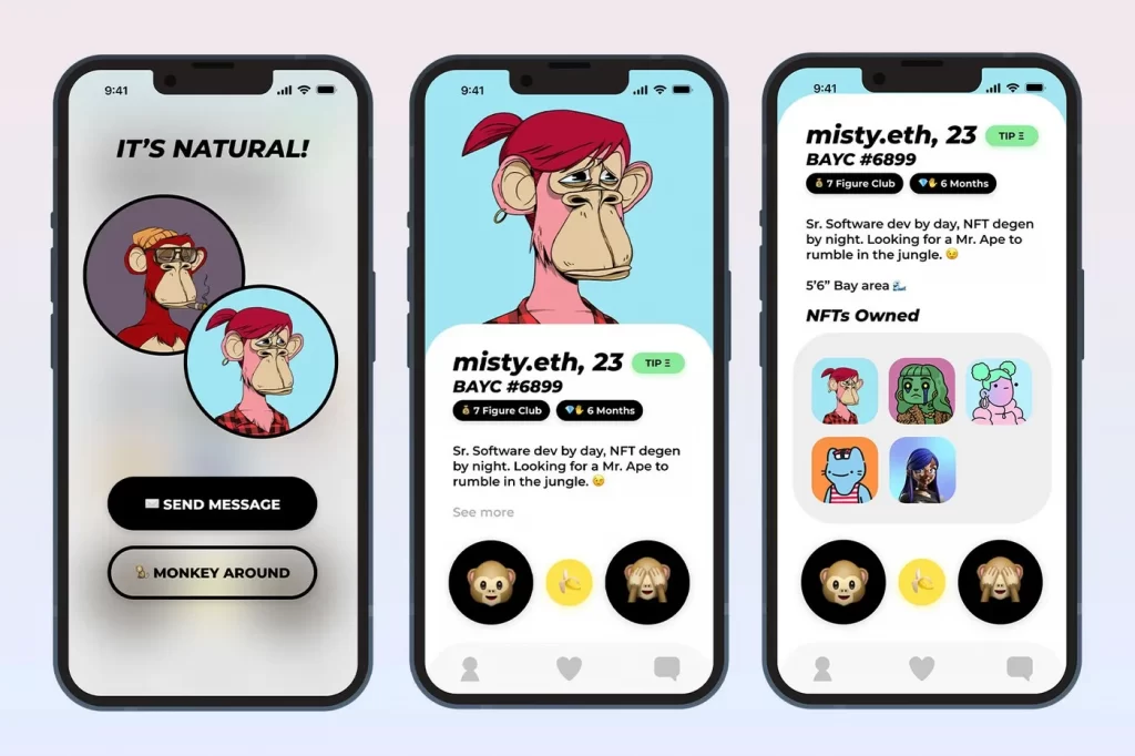 LADC obecnie dostępna jest tylko i wyłącznie dla właścicieli 'Bored Ape Yacht Club’ NFT („małp”, o których pisaliśmy wcześniej), ale w przyszłości będą mogli korzystać wszyscy posiadający dowolne tokeny NFT i kryptowaluty. Od typowej aplikacji randkowej różni się tym, że nie trzeba zakładać profilu, wrzucać zdjęć czy tworzyć mini prezentacji własnej osoby. Jedyną istotną kwestią jest zasobność cyfrowego portfela, bo właśnie na tej podstawie użytkownicy oceniają „potencjał” kandydata/ki.