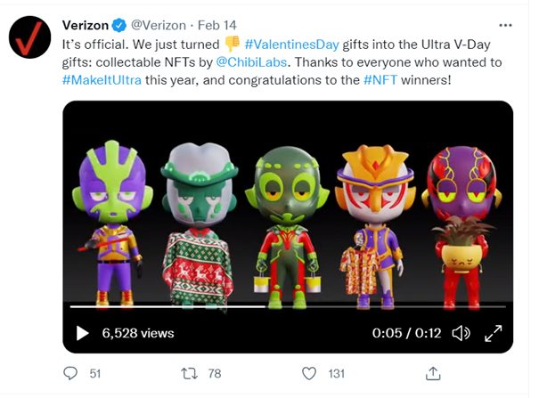 Verizon wszedł do świata NFT pytając konsumentów o najgorszy prezent walentynkowy, jaki kiedykolwiek otrzymali. Chętni do podzielenia się informacją, mogli wziąć udział w konkursie „Token of Love”, w którym nagrodą było zamienienie ich nietrafionego prezentu w NFT. Akcja została ogłoszona na Twitterze i trwała 4 dni. By wziąć udział w konkursie wystarczyło opublikować tweet opisujący najgorszy prezent, oznaczając Verizon hashtagiem #MakeItUltra. Aktywacja była elementem kampanii 5G Ultra Wideband. Osiemnastu zwycięzców otrzymało swój prezent w formie zabawnego NFT. NFT są widoczne i dostępne do odsprzedaży na platformie OpenSea.